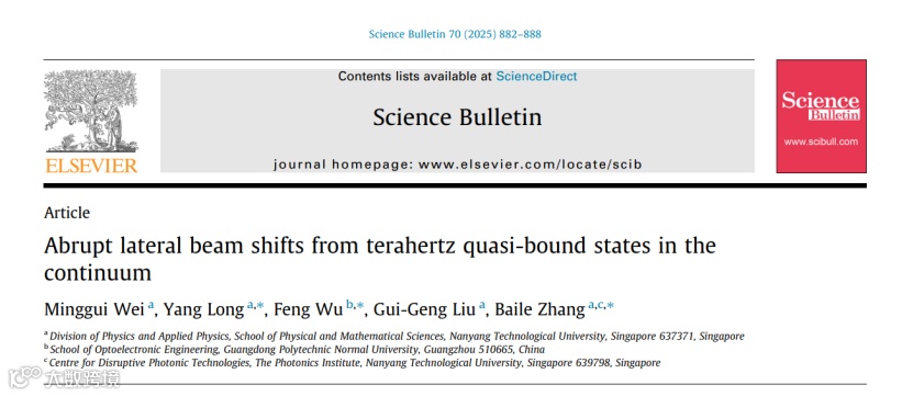 近日,新加坡南洋理工大学魏明贵博士后、龙洋博士后、张柏乐教授与广东技术师范大学吴丰副教授合作,利用太赫兹场扫描技术,实验验证了由准连续域束缚态(quasi-bound state in the continuum, QBIC)诱导的侧向光束位移突变,并表征了QBIC能带。通过折叠布里渊区,我们在亚波长光栅−波导复合结构中实现了QBIC能带,该能带上的所有本征态均为QBICs。较为特别的是,这类BIC来源于动量失配,故可被称之为动量失配驱动型BIC。在特定入射角下激发时,这些QBICs会引起显著的侧向光束位移。然而,当频率偏离QBIC能带时,侧向光束位移迅速减小。相关成果以“Abrupt lateral beam shifts from terahertz quasi-bound states in the continuum”为题于2025年3月23日在线发表于期刊《Science Bulletin》上。新加坡南洋理工大学魏明贵博士后为第一作者,广东技术师范大学吴丰副教授、新加坡南洋理工大学龙洋博士后和张柏乐教授为共同通讯作者。新加坡南洋理工大学刘癸庚博士后(现为西湖大学助理教授)对本论文的工作提供了重要贡献。