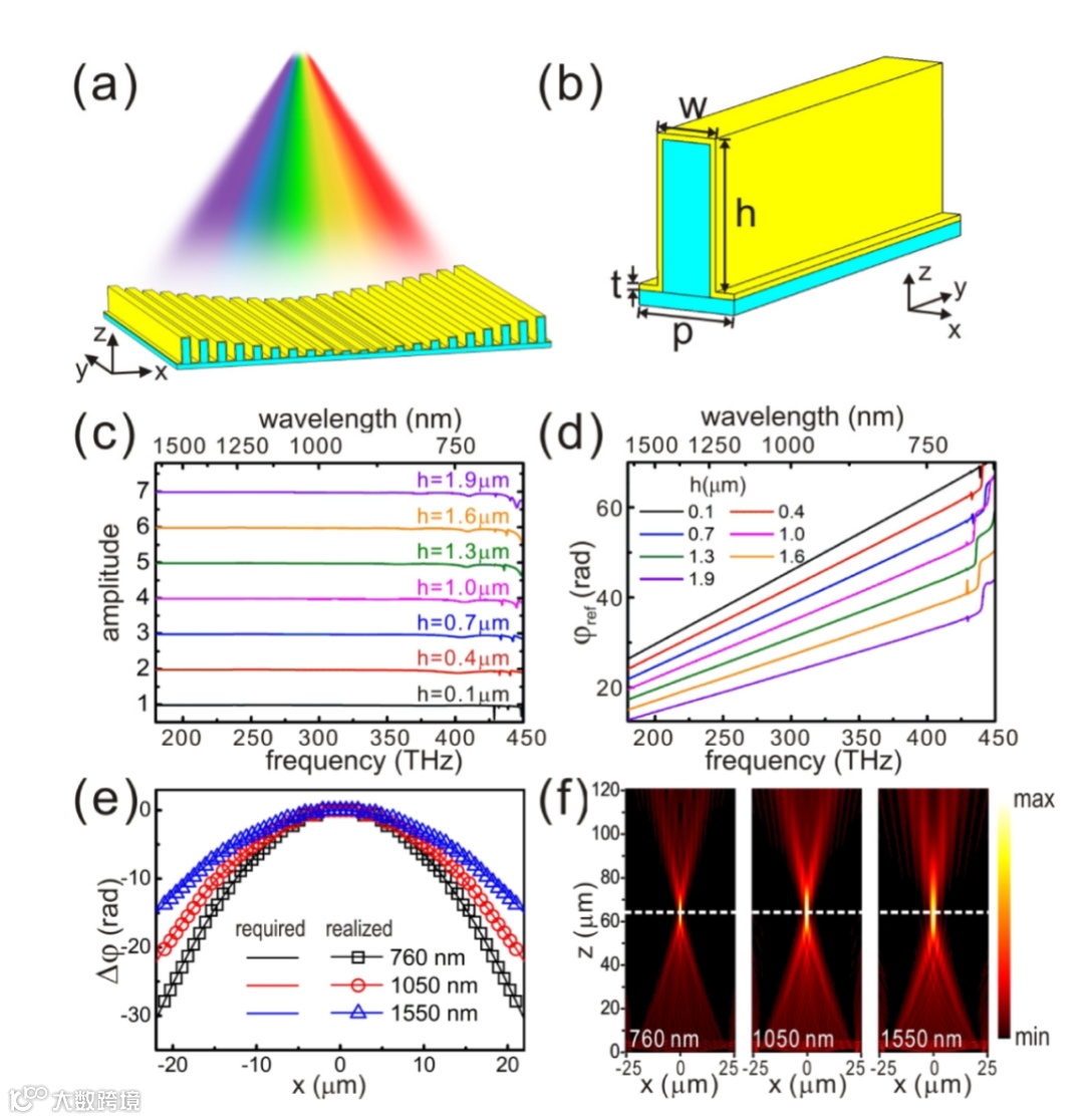光学镜片会改变光的波阵面,从而产生聚焦或散焦的效果。 对于常规透镜,波前是由光学材料的厚度引起的相移而成形的。这种方法通常体积大且笨重,因此对于集成光学系统而言变得极具挑战。最近开发的超构透镜(metalenses)在尺寸和重量方面与传统镜片相比具有明显的优势。色差代表镜头无法将不同波长的光聚焦到同一焦点时产生的效果。为了解决这个问题,已经开发了诸如消色差双合透镜的混合眼镜来校正色差。或者可以使用衍射光学元件来补偿常规光学材料的色差。这两种方法不太可能满足集成光子在重量和体积方面的关键要求。对于用周期性排列的单元构造的金属传感器,光栅方程确定光的衍射角的正弦值与波长成正比。同时,电磁(EM)响应模式与波长相关。因此,许多超构透镜仅适用于单个波长或非常窄的波长范围。