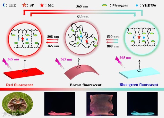 在自然界中,许多生物能够协同改变它们的形状和颜色,实现伪装、交流或恐吓,以便在它们的环境中生存。如头足类动物在捕猎或躲避捕食者时,会同时改变外观以融入周围环境。皱褶蜥蜴会展开头部六倍宽的皱褶,同时将皱褶颜色变为橘红色,以调节体温和恐吓捕食者/对手。这些奇妙的生物学行为激发了研究人员开发智能自适应性材料的能力,这种材料能够根据环境变化来调整其颜色和形状。到目前为止,具有变色荧光和同时改变形状能力的智能水凝胶更具吸引力,因为它有可能在黑暗中伪装、恐吓和沟通。尽管已经实现了对水凝胶中荧光颜色和形状的协同控制,但是不幸的是,在先前报道的系统中仍然存在局限性:当水凝胶被致动时需要可变的水性环境,在这种情况下,接触操作模式会限制它们的应用;水凝胶驱动器的变形速率相对较慢,并且由于离子和pH值改变困难,颜色转换不方便;水凝胶驱动器的变形简单,难以实现高空间分辨率原位操作。因此,制造这种具有高可编程性、可在高空间分辨率下进行原位操纵的软驱动器仍然具有挑战性。然而,液晶(LC)驱动器的发展为克服上述许多缺点提供了灵感。基于可操纵和可编程的介观定向,可以轻松实现3D运动和对该运动的精确远程控制。另外,在外部刺激下,由LC的相变或取向重整引起的变形很快且很大。以上优势使LC执行器可以用于软体机器人。因此,在液晶执行器中实现3D变形和变色荧光的协同控制对于赋予软体机器人更多的仿生功能具有重要意义。