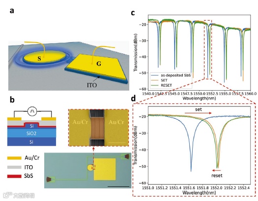 传统的硅光子集成电路(PICs)调谐方法主要依赖于热光效应或自由载流子色散效应。基于绝缘体上硅的热光学移相器(SOI)平台虽然体积小,但速度慢且功耗大。基于自由载流子的相移色散效应可以显著降低功耗,提高大型设备的调制速度但是由于折射率变化小,因此器件较大(>100μm)。为了克服这些限制,硅光子学领域已经开始转向一种混合方法,将外来材料集成到SOI波导中,作为调谐介质。相变材料(PCMs)长期以来被用作可重写光盘的存储介质,后来又被用于随机存储器。近年来,PCMs与纳米光子结构的集成为非易失性可重构光学引入了新的范式。然而,原型PCM Ge2Sb2Te5在可见光和远程通信波段的高损耗从根本上限制了它的应用。Sb2S3是一种宽带隙PCM,其透射窗口范围从610 nm到近红外。