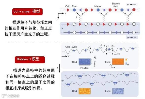图:一维格点Schwinger模型描述正反粒子通过电场传递相互作用,而正负粒子湮灭后转化成了电场激发。一维Hubbard模型描述光晶格中的冷原子隧穿和相互作用的过程,在特定的势阱形状下,一维Hubbard模型与Schwinger模型的群对称性相同。