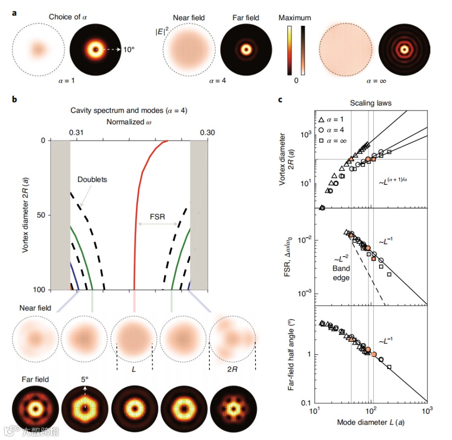 图3 用有效折射率为2.6的二维计算研究了涡旋尺寸的函数。(a)相同涡径2R=100a的不同α的近场和远场比较。(b)腔谱和模式剖面。(c)在大模极限下的模径(L)尺度、FSR的尺度、远场角度尺度。