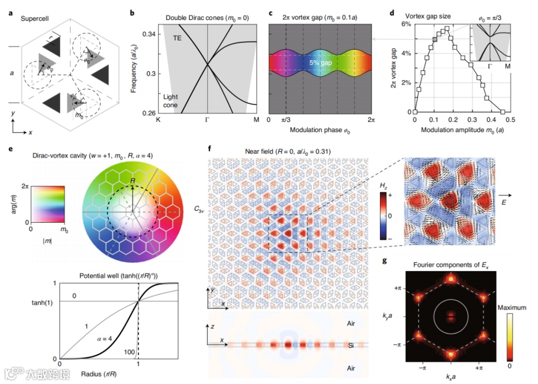 图2 利用三维模拟方法设计了空气包覆硅膜(0.46a厚,n= 3.4)中的光子晶体涡旋腔(a)广义Kekulé调制的蜂窝超级单元,其中三角形空气孔有r=0.32a。(b)双狄拉克锥带结构的无扰超细胞内的阴影光锥。(c)带隙打开ϕ0的2π角和非零m0,其中循环色图表示调制的相位。(d)带隙大小作为m0的函数。(e)说明了狄拉克涡旋腔和势阱功能。(f)拓扑模式的近场。(g) 傅立叶变换场∣FT(Ex)∣在动量空间中的大小,其中概述了原始单元和光锥的布里渊区边界。