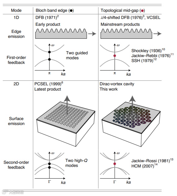 图1 比较了Dirac涡旋腔和三种商业化半导体激光腔的单模工作。均匀晶格的腔,包括一维DFB和二维PCSEL,具有两种相互竞争的高Q带边模式。拓扑缺陷的腔,相移的DFB和Dirac涡旋腔,都有一个单一的中间带隙模式。