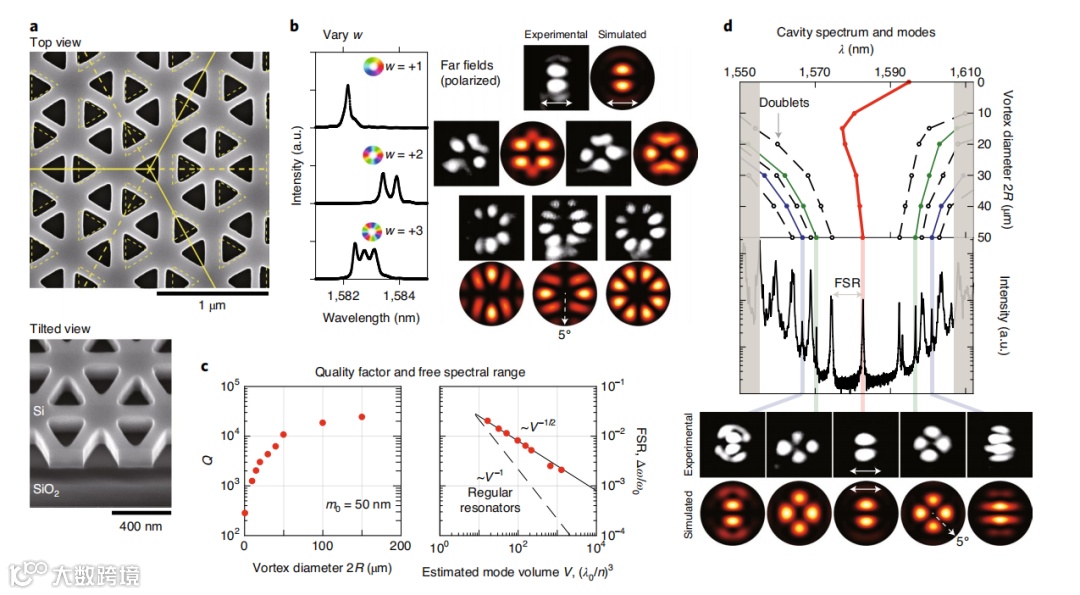 (a)具有R=0μm(0a)和w=1的空腔的扫描电子显微镜图像。黄色的线条说明了C3v的对称性和空气孔的相对位移。(b)具有2R=50μm(100a)的不同绕组数腔模的光谱和远场。(c)单涡(w=1)腔的Q值和FSR值随涡旋尺寸R和估计模体积V的变化而变化。(d)腔谱作为涡旋大小的函数。