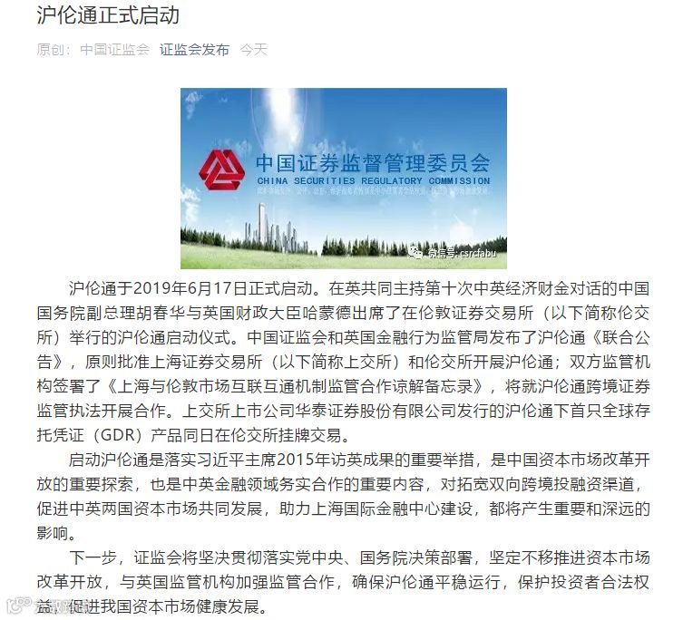 沪伦通于2019年6月17日正式启动。