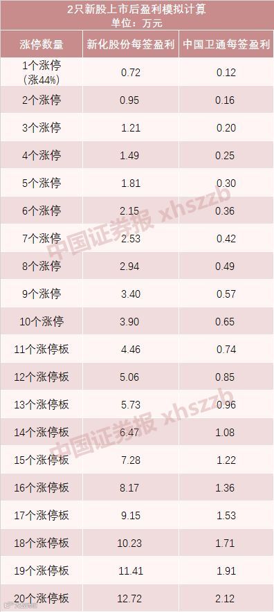 新化股份、中国卫通新股上市后,如果能达到今年以来上市新股的平均水平——7个涨停板的话,则每签获利分别约为2.53万元、0.42万元。如果中国卫通能收获10个涨停板的话,其每签获利约为0.65万元。