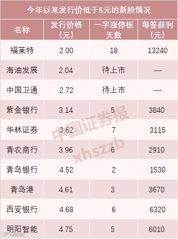 两只新股中,中国卫通的发行价为2.72元/股,是今年以来的第三低价新股,打新收益恐不乐观。在5月至今的上市新股中,有5只新股发行价低于10元,平均收获了9.6个一字涨停板。