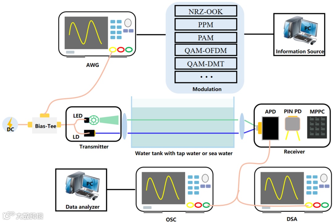 水下通信系统的研究大多是先在实验室进行演示,然后逐步应用到实际水下环境中。一个典型的实验室视线 UWOC系统由三部分组成,如图4所示,包括发射单元、水下信道和接收模块。发射单元由光源装置、调制器、光放大器和光学透镜等组成。接收模块由放大电路、光学滤波器、光学透镜和光电探测器等组成。在发射端,信息源产生的信息经过编码和调制处理后,加载到任意信号发生器(AWG)上。然后AWG输出经过调制的交流电信号,通过bias-tee与直流电结合,驱动光源发射装置发出光载波。调制后的光信号经发射透镜准直后通过水箱。水箱内装满自来水,用于模拟水下链路,实验中通常利用反射镜来实现远距离传输。为了模拟真实的水下环境,通常会在水中加入Maalox和海盐等作为散射剂。在接收端,光信号将被接收透镜聚焦,然后被光电探测器捕获。经光电探测器转换后的电信号将经过放大器和低通滤波器进行进一步优化,然后传送到示波器(OSC)或信号质量分析仪(DSA)进行解码和解调,从而恢复到原始信号,计算机或误码率模块将收集原始信息进行进一步分析。
