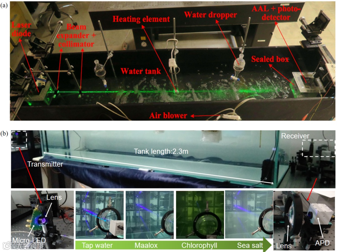 图3. 在具有(a)不同的气泡,温度和盐度环境以及(b)不同水质下的实际UWOC系统配置。(图(a)引用自文献“M.V. Jamali, A. Mirani, A. Parsay, B. Abolhassani, P. Nabavi, A. Chizari, P. Khorramshahi, S. Abdollahramezani, J.A. Salehi, Statistical studies of fading in underwater wireless optical channels in the presence of air bubble, temperature, and salinity random variations, IEEE Transactions on Communications 66 (2018) 4706-4723.” 图(b)引用自文献“P.F. Tian, H.L. Chen, P.Y. Wang, X.Y. Liu, X.W. Chen, G.F. Zhou, S.L. Zhang, J. Lu, P.J. Qiu, Z.Y. Qian, X.L. Zhou, Z.L. Fang, L.R. Zheng, R. Liu, X.G. Cui, Absorption and scattering effects of Maalox, chlorophyll, and sea salt on a micro-LED-based underwater wireless optical communication [Invited], Chinese Optics Letters 17 (2019) 100010.”)