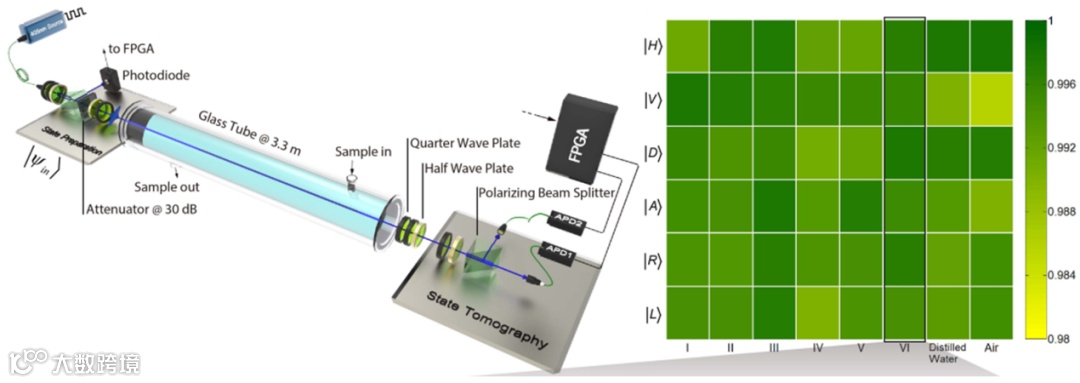 图7. 单光子量子态传输实验系统示意图。(图引用自文献“L. Ji, J. Gao, A.-L. Yang, Z. Feng, X.-F. Lin, Z.-G. Li, X.-M. Jin, Towards quantum communications in free-space seawater, Optics Express 25 (2017) 19795-19806.”)