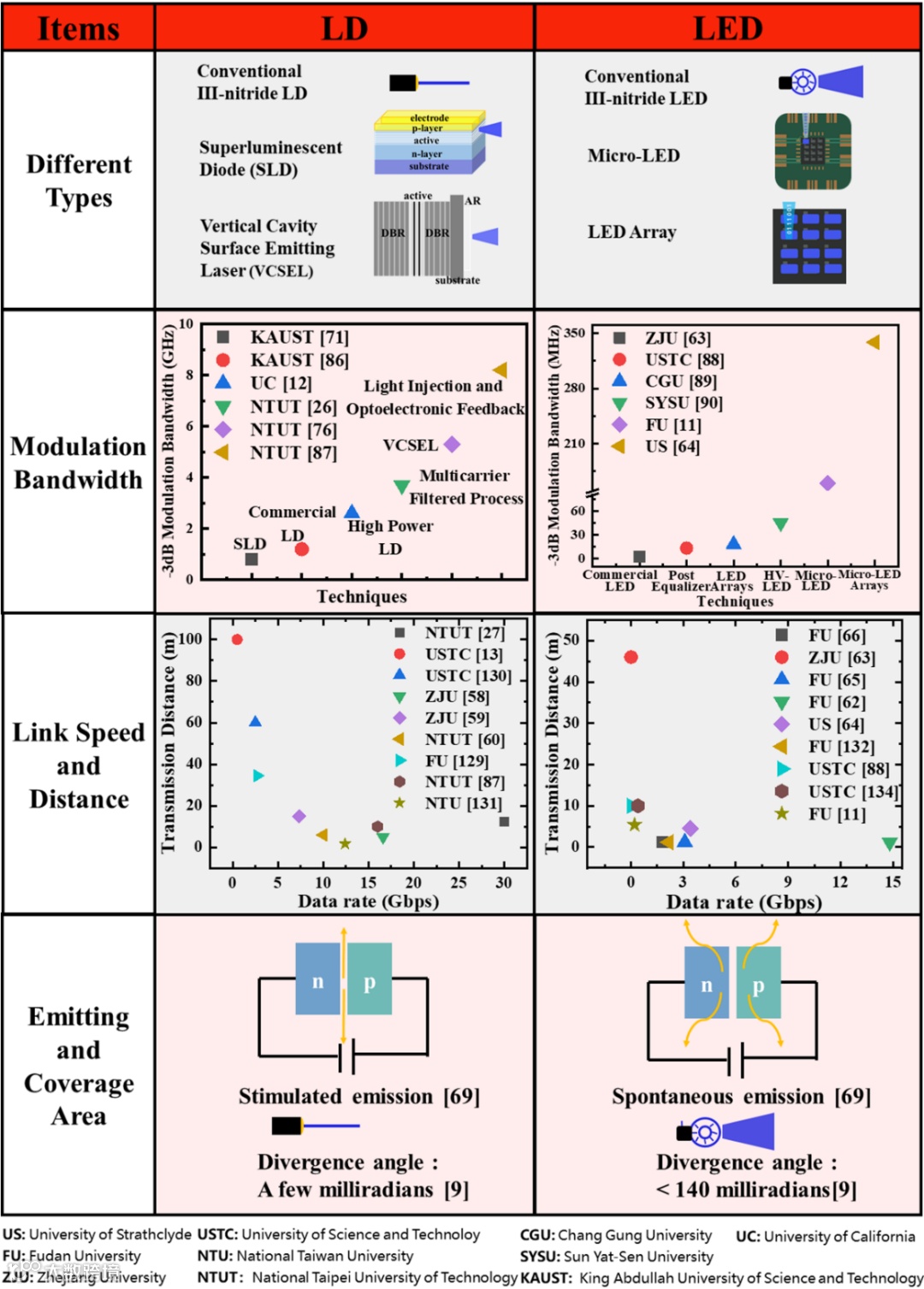 图5. UWOC系统发射机的研究进展总结,展示了不同光源类型的调制带宽、传输数据速率和距离、覆盖面积等内容。