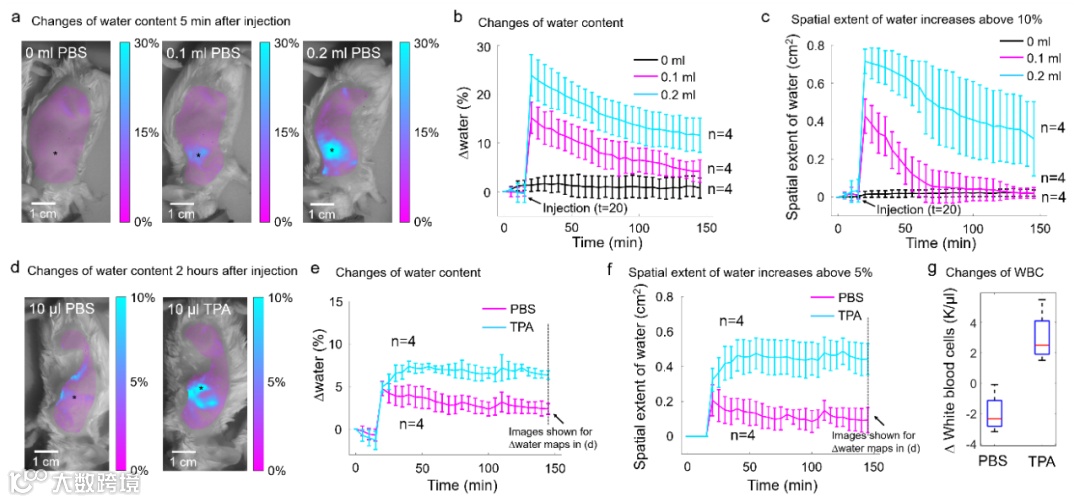 1. 人体含有大约70%的水分,组织中的水含量和水肿、炎症反应等生理、疾病过程密切相关;皮肤衰老的过程也伴随着水分的减少。针对上述应用,该研究展示了对小动物模型水肿和炎症反应的实时、量化监测能力,包括对组织水分含量、空间分布的监测,如图2所示。