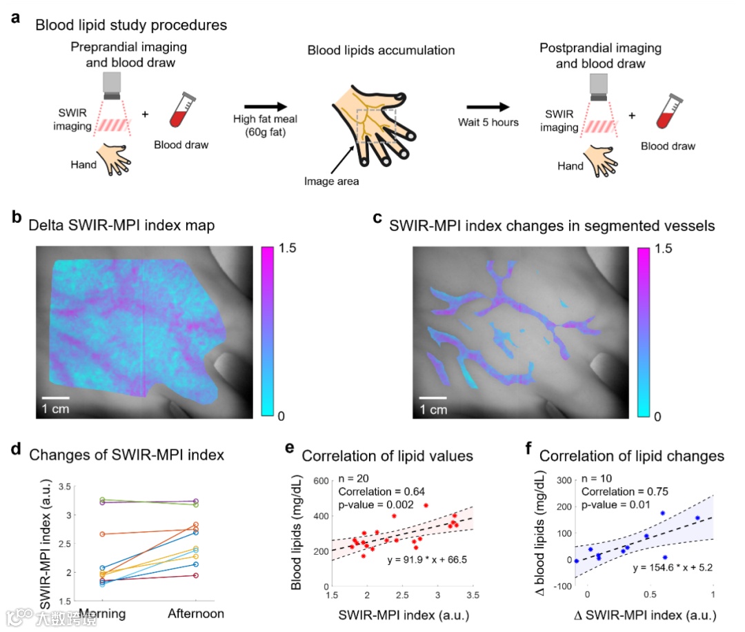 2. 人体血液中脂肪的含量(血脂)与心血管疾病、肥胖症等密切相关。目前临床上血脂检查需采集静脉血进行测定,这一有创检测过程伴随痛感并存在感染风险,且检测速度较慢,难以对临床上血脂异常的早期干预和治疗提供实时反馈。该研究初步展示了对人体血脂的无创、非接触监测,如图3所示。