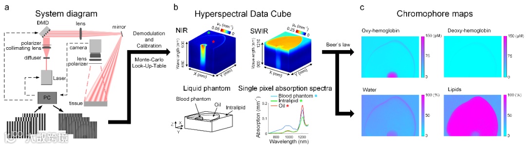 针对以上技术难题,北京航空航天大学赵雁雨副教授和波士顿大学Darren Roblyer副教授课题组近日报道了他们在水和脂肪无标记、非接触量化成像方面的最新研究成果。他们通过短波红外结构光进行高光谱成像,利用水和脂肪在短波红外波长独特的光学吸收特性,针对光在生物组织中的传播建立计算模型,首次实现了在短波红外波段利用结构光对生物组织的光学吸收和散射系数进行测量,并以亚毫米分辨率实现了对组织中水和脂肪含量、分布的无标记、非接触、大视场量化成像,如图1所示。该研究成果于2020年10月23日以“Shortwave-infrared meso-patternedimaging enables label-free mapping of tissue water and lipid content”为题发表在Nature Communications。