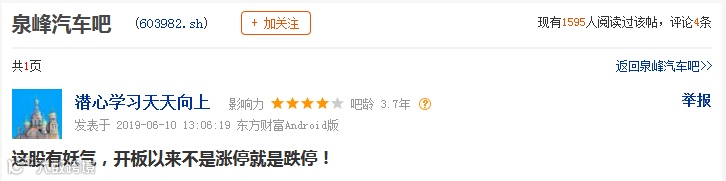 6月3日该股走出“天地板”行情后,6月4日又由跌停到涨停,上演“地天板”行情,连续两天振幅在20%左右。
