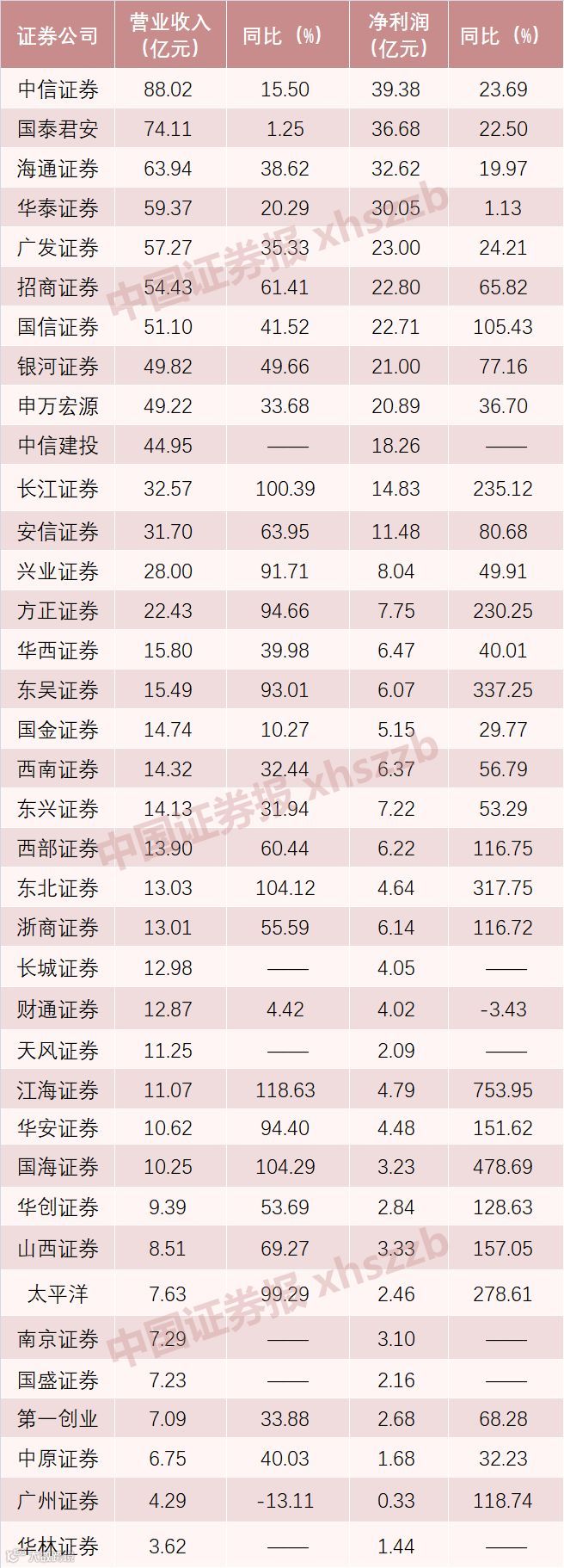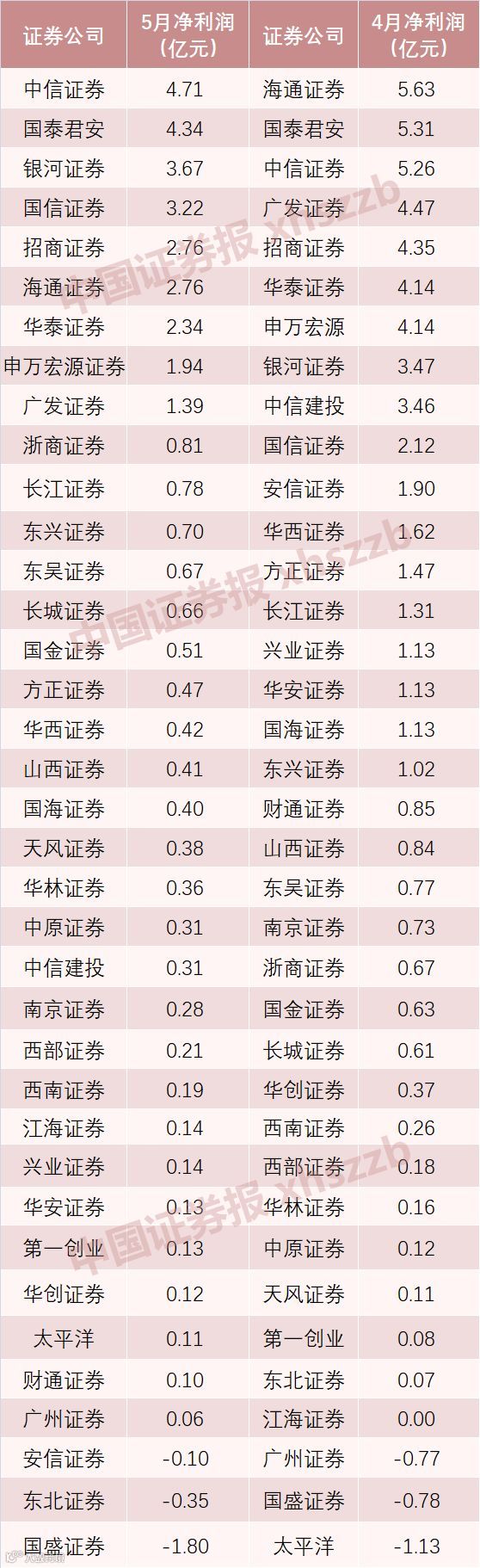 37家券商4月、5月净利润排名比较
