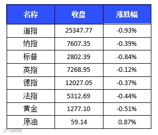 美三大股指周二集体下跌。道琼斯工业平均指数下跌237.92点,跌幅0.93%,报25347.77点。纳斯达克综合指数下跌29.66点,跌幅0.39%,报7607.35点。标普500指数下跌23.67点,跌幅0.84%,报2802.39点。