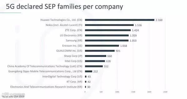 德国专利数据公司IPlytics最新报告显示,截至6月15日,目前全球5G SEP标准必要专利排名中,华为声明的5G SEP专利数高达2160个,排在第一位。第二名诺基亚5G SEP专利为1516个,第三名中兴为1424个。