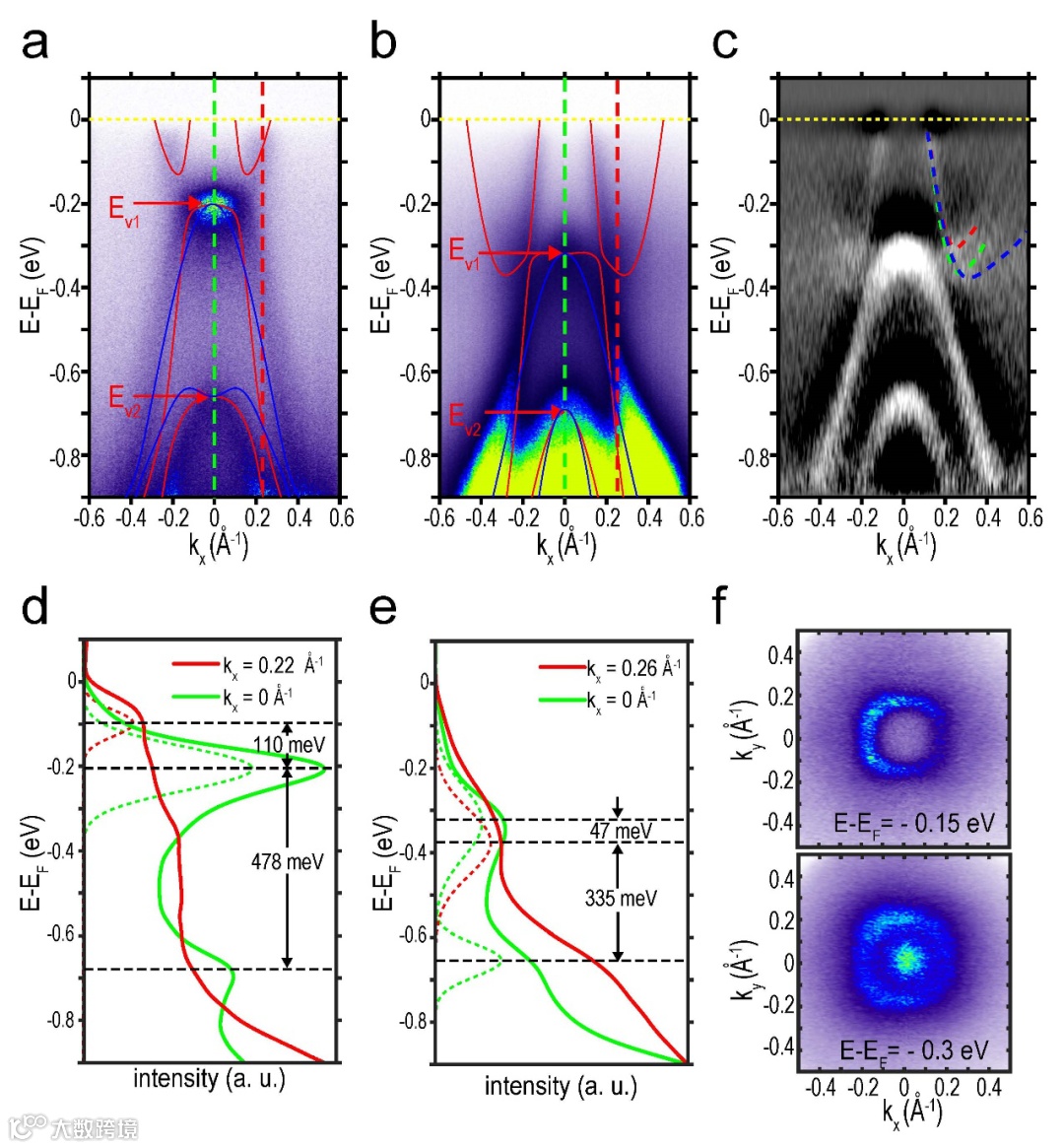 图三 a & d. 生长在石墨烯上的1T’-WSe2的角分辨光电子能谱;b, c, e, f. 生长在SrTiO3上的纯相1T’-WSe2的角分辨光电子图。