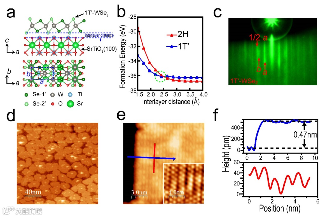 图一 a. 生长在SrTiO3衬底上的1T’-WSe2晶体结构模型;b. 1T’相和2H相的形成能比较;c. 1T’-WSe2薄膜样品的高能电子衍射图;d-f. 1T’-WSe2薄膜的扫描隧道显微镜图。