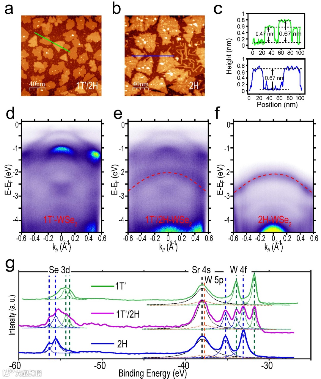 图二 a-c. 1T’/2H混合相和2H纯相的WSe2薄膜的扫描隧道显微镜图;d-f. 1T’纯相、1T’/2H混合相、和2H纯相的WSe2薄膜的角分辨光电子能谱图;g. 1T’纯相、1T’/2H混合相、和2H纯相的WSe2薄膜的X射线能谱图。