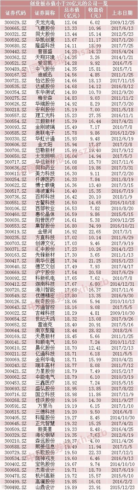 中证君整理了一份创业板市值小于20亿元的公司名单。预计部分标的要欢欣雀跃一阵子了。