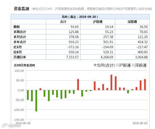 进入6月以来,北向资金重启了净流入。20日北向资金也持续流入A股,截至收盘,合计净流入55.65亿元,其中沪股通净流入19.14亿元,深股通净流入36.5亿元。