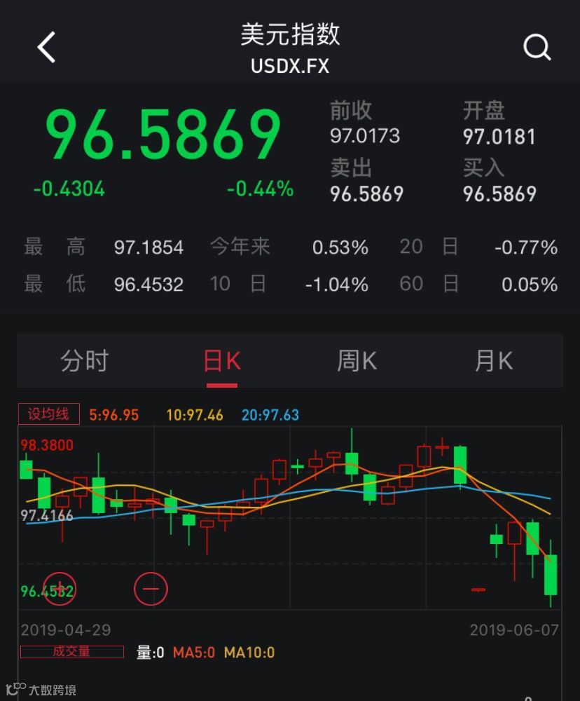 美元指数则下跌0.44%,报96.5869,跌破97整数位关口,为连续第二日下跌。