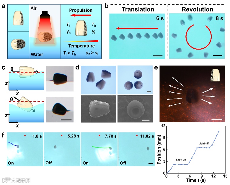 图1展示了由光热马兰戈尼效应驱动的微马达的设计与制造。该微马达由一个各向异性的子弹状聚二甲基硅氧烷(PDMS)微颗粒构成,其一侧分布着Fe₃O₄纳米颗粒(NPs)。当微马达在水面上受到NIR照射时,Fe₃O₄-NPs通过光热效应吸收NIR光并将其转化为热能以产生温度梯度(图2a),进而导致表面张力不平衡,驱动微马达从低表面张力区域向高表面张力区域,即从热区向冷区移动。微马达的运动受其在水面上的方向影响,表现出平移或公转运动。