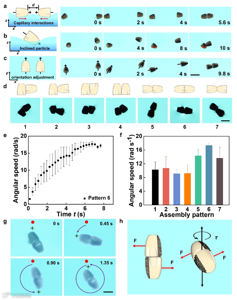 与单个单元不同,群体和组装体在自然界中可以表现出复杂的集体行为和协作功能。有趣的是,我们的实验表明多个微马达可以自发组装成更高级的结构并展现出单个微马达不具备的自转运动。该自组装过程由毛细相互作用驱动,最常形成的为链状结构,有趣的是,微马达可以在组装过程中调整其方向。例如,最初彼此平行的微马达可以旋转以形成链状结构(图3c)。
