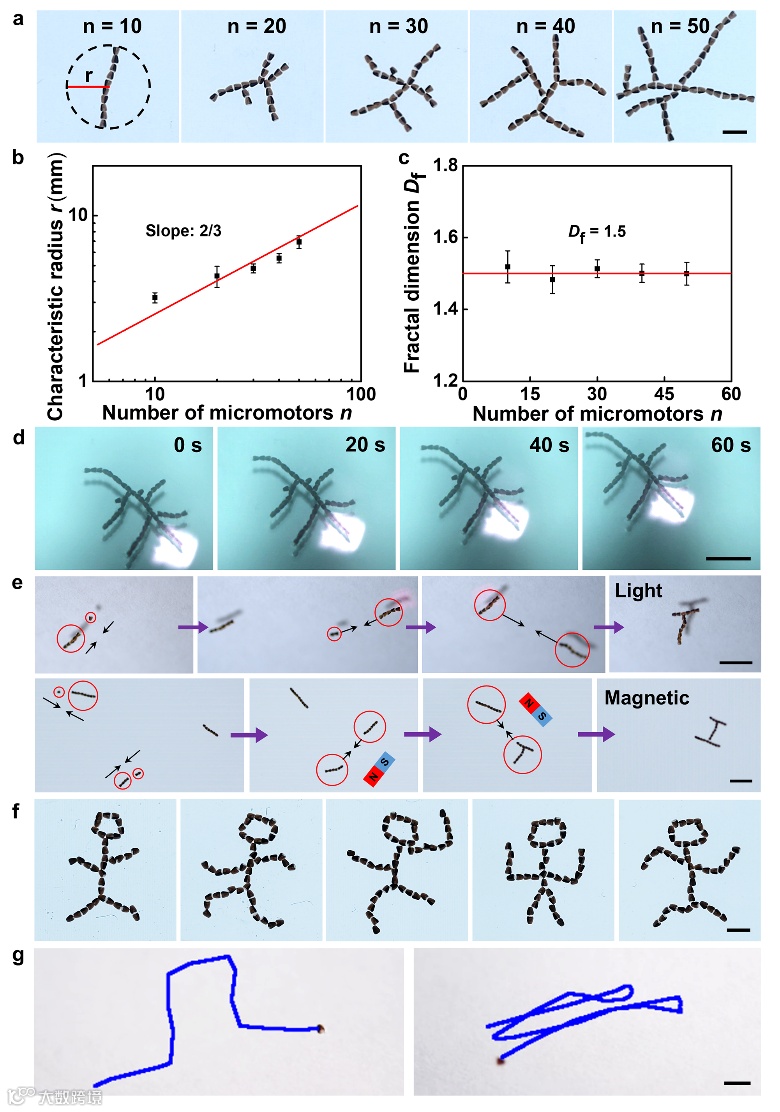 当微粒数量达到10个时,自组装结构大致保持链状形态。然而,随着数量增加到20、30、40和50时,结构转变为由多个支链组成的分形超结构,且相同数量的微粒所形成的结构具有相似的特征半径。此时产生的超结构的尺寸大于NIR尺寸,只有暴露在NIR照射下的微粒才能将光转化为热能以驱动运动(图5d)。因此,可以将超结构的不同部分暴露于NIR照射下来调整运动的方向、轨迹甚至模式。