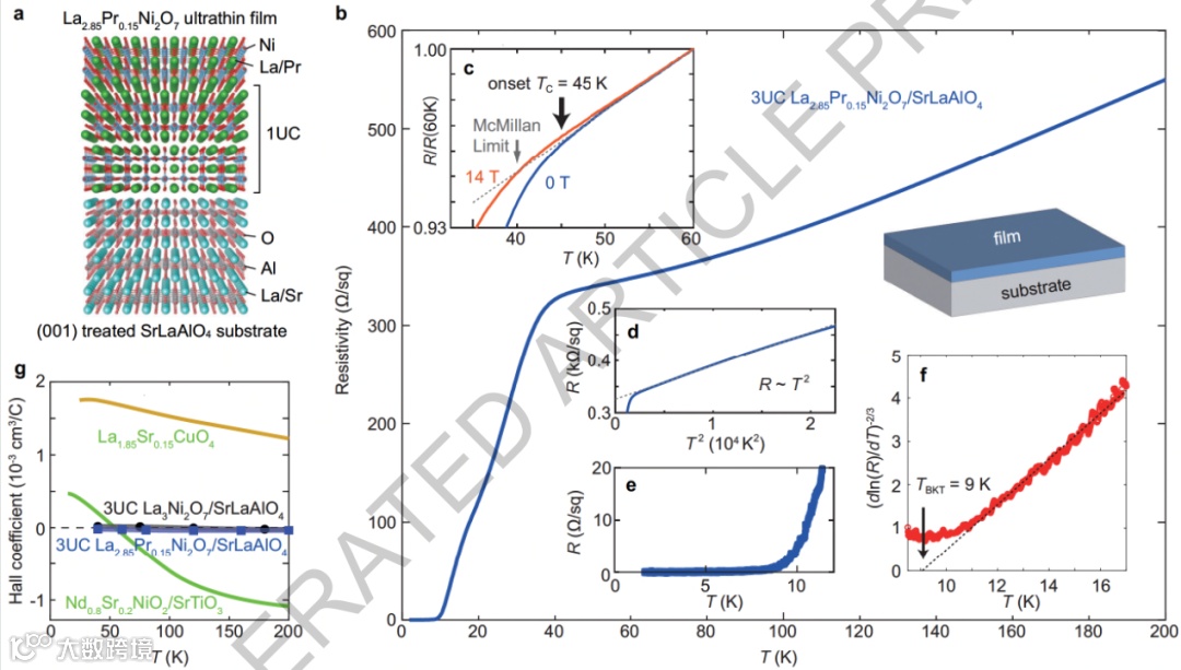 总之,本研究通过GOALL外延法在SrLaAlO₄衬底上生长出高质量的La₂.₈₅Pr₀.₁₅Ni₂O₇薄膜,实现了环境压力下的超导性,起始温度为45 K,高于麦克米伦极限(40K)。薄膜表现出BKT类转变行为,TBKT=9K,与迈斯纳温度TM=8 K一致。磁响应在临界磁场中显示出各向异性,表明超导性具有二维特征。这一成果为镍酸盐在常温下实现高于77 K(液氮沸腾温度)的超导转变奠定了基础。