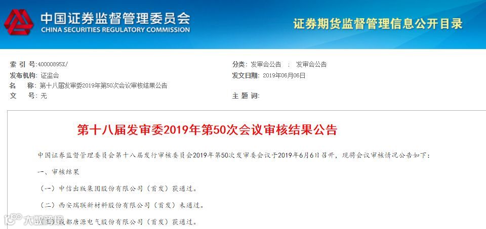6月6日,证监会发布第十八届发审委2019年第50次会议审核结果公告称,中信出版集团股份有限公司和成都唐源电气股份有限公司2家企业的首发申请获通过,西安瑞联新材料股份有限公司首发申请未通过。此外,由于浙江才府玻璃已经撤回其申报材料,证监会决定取消第51次会议对其申报文件的审核。