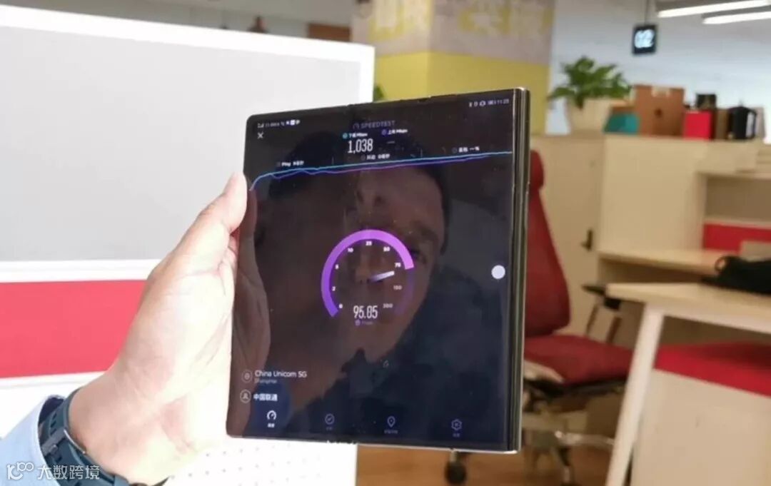图为华为手机产品线总裁何刚用华为5G手机联入中国联通的5G网络,进行网速测试,下行速率超过1Gbps