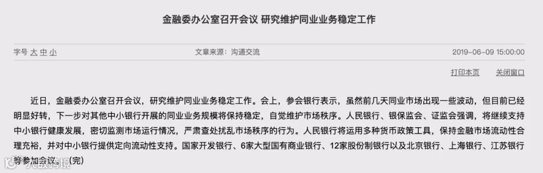 在金融委会议上,参会银行表示,虽然前几天同业市场出现一些波动,但目前已经明显好转,下一步对其他中小银行开展的同业业务规模将保持稳定,自觉维护市场秩序。