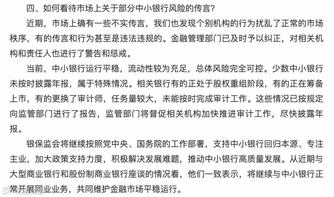 今日中午,银保监会新闻发言人在答《金融时报》记者问时强调:当前,中小银行运行平稳,流动性较为充足,总体风险完全可控。从近期与大型商业银行和股份制商业银行座谈的情况看,他们一致表示,将继续与中小银行正常开展同业业务,共同维护金融市场平稳运行。