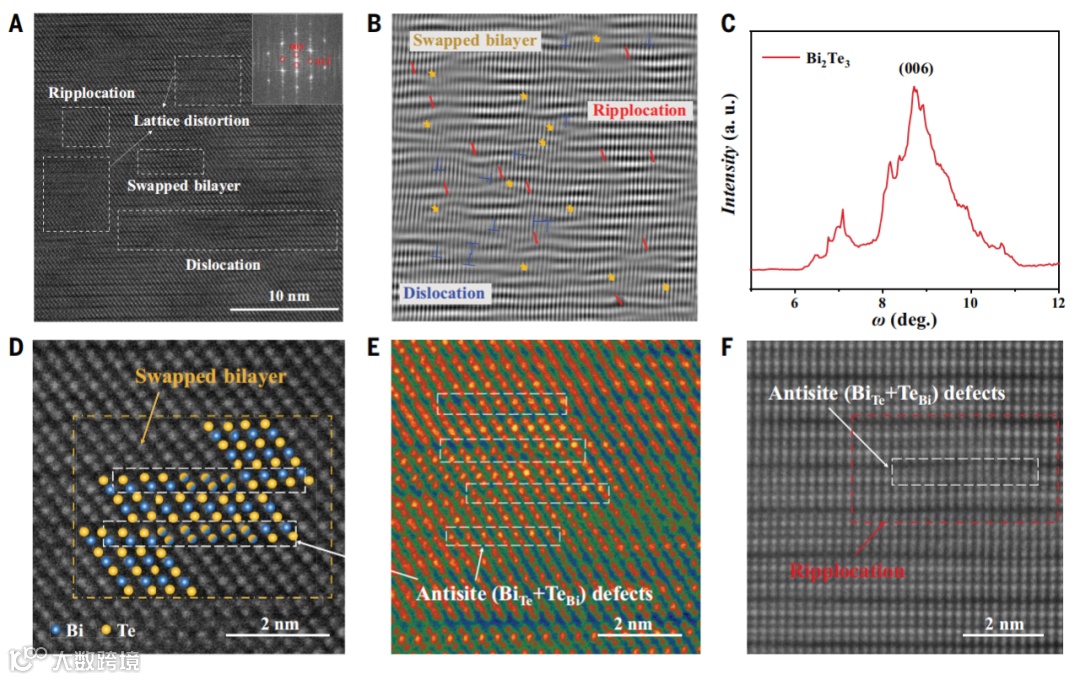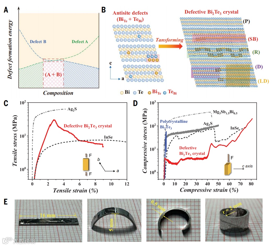 )基热电半导体为例,展示了缺陷工程如何改变脆性半导体的机械性能。研究发现,抗位错BiTe和TeBi缺陷的共存可以在体晶体中导致高密度、多样化的微观结构(例如,线缺陷(位错和层错位错)、平面缺陷(交换双层和超位错)以及晶格畸变)。这不仅在室温下导致了非凡的塑性(图1C),同时也提高了热电优值(zT = 1.05)(图1D)。本文的策略是将脆性材料转变为更具塑性的行为,这也能够提高塑性半导体的热电性能,使其与脆性热电材料更具竞争力。