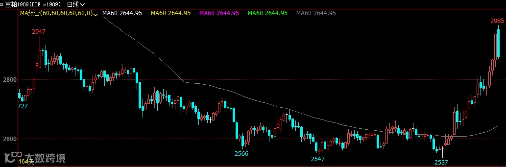 从市场关注的油脂油料价格来看,相关期货品种涨势开始于4月末。以豆粕期货为例,主力1909合约4月30日盘中一度创下阶段新低2537元/吨,随后便踏上上涨的“征程”,5月30日创下2018年9月17日以来新高2985元/吨,区间最大累计上涨17.66%。