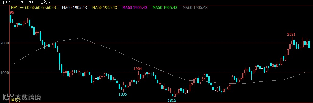 玉米期货也维持高位运行,主力1909合约4月以来出现加速上涨,5月20日一度创下2018年11月20日以来新高2021元/吨,随后维持高位整理,近期围绕2000元/吨一线上下运行。