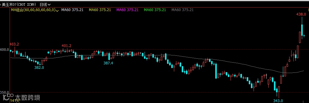 美玉米期货价格走势更为强势,07合约也于5月13日触底反弹,价格一度从343美分/蒲式反弹至438美分/蒲式,区间累计最大涨幅为27.70%。