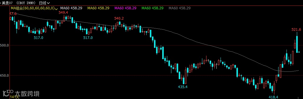 美麦期货主力07合约亦在同日(5月13日)创下阶段新低418.4美分/蒲式,随后一路攀高,5月29日一度创下新高521.6美分/蒲式,区间累计最大涨幅为24.67%。