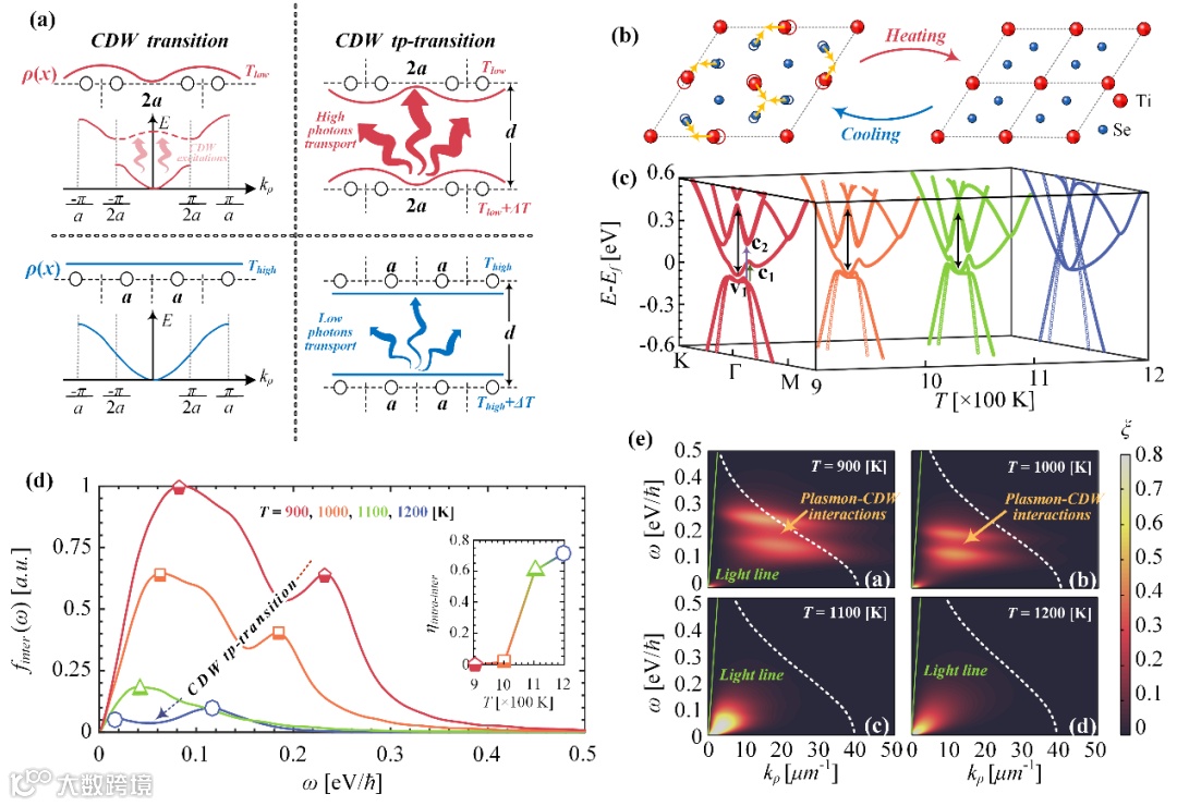 图 (a) CDW跃迁的辐射换热示意图;(b) CDW和标准晶体结构;(c) 不同序态下的电子能带结构;(d) 光谱热流量演化趋势;(e) 热光子隧穿行为特性