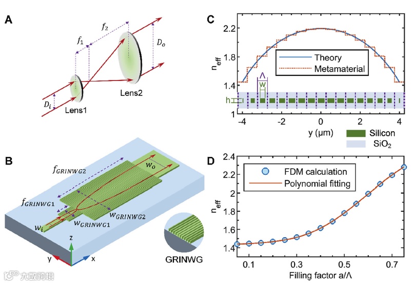 片上光子器件在通信、微波光子信号处理、量子信息、传感和计算等许多应用领域显示出巨大的潜力。最近,科研人员提出了在芯片上操作控制自由空间光束的新颖设计理念。将片上元件与自由空间器件相类比,比如镜片,展示了在轨迹和波前的控制方面的极大的优势。例如,基模模斑转换器(SSCs)就采用了聚焦透镜。伊顿透镜已被证明可以使芯片上的光轨迹发生弯曲,麦克斯韦鱼眼透镜的无像差成像特性已被用于构建交叉多模波导(MWG)。然而,所报道的方案只被证明用于基模,而高阶模或非正则模在特定应用中是首选的模式。4-f系统在傅里叶光学中广泛应用于光学信息处理。
