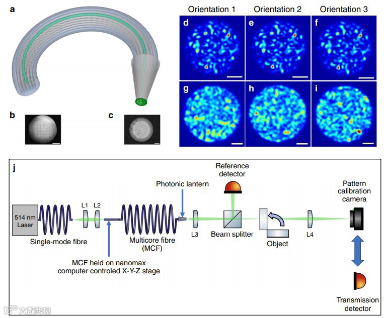 近日,来自英国赫里瓦特大学光子与量子科学研究所的Debaditya Choudhury等人演示了一种使用多芯光纤(MCF)的高分辨率显微内窥镜检查方法,该光纤具有通过渐缩形成的绝热多模到单模“光子灯笼”过渡。他们表明,通过单独激励单模MCF的芯,可以从灯笼的输出中投射出不同的多模光图案,并且这些图案对于光纤运动非常稳定。然后,利用此功能来演示单像素成像的形式,其中使用单个像素检测器来检测每个多模模式穿过物体的光的比例。他们使用了一种称为SARA-COIL的自定义计算成像算法,仅使用预先测量的多模模式本身和检测器信号来重建对象。相关研究工作发表在《Nature Communications》上。(詹若男)
