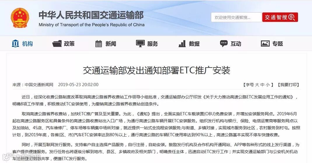 随后,交通运输部印发了《关于大力推动高速公路ETC发展应用工作的通知》,在全国范围内全面开始推动ETC的免费安装工作。2019年6月起在高速公路服务区和具备条件的高速公路收费站出入口广场,为通行高速公路车辆开展ETC安装服务。