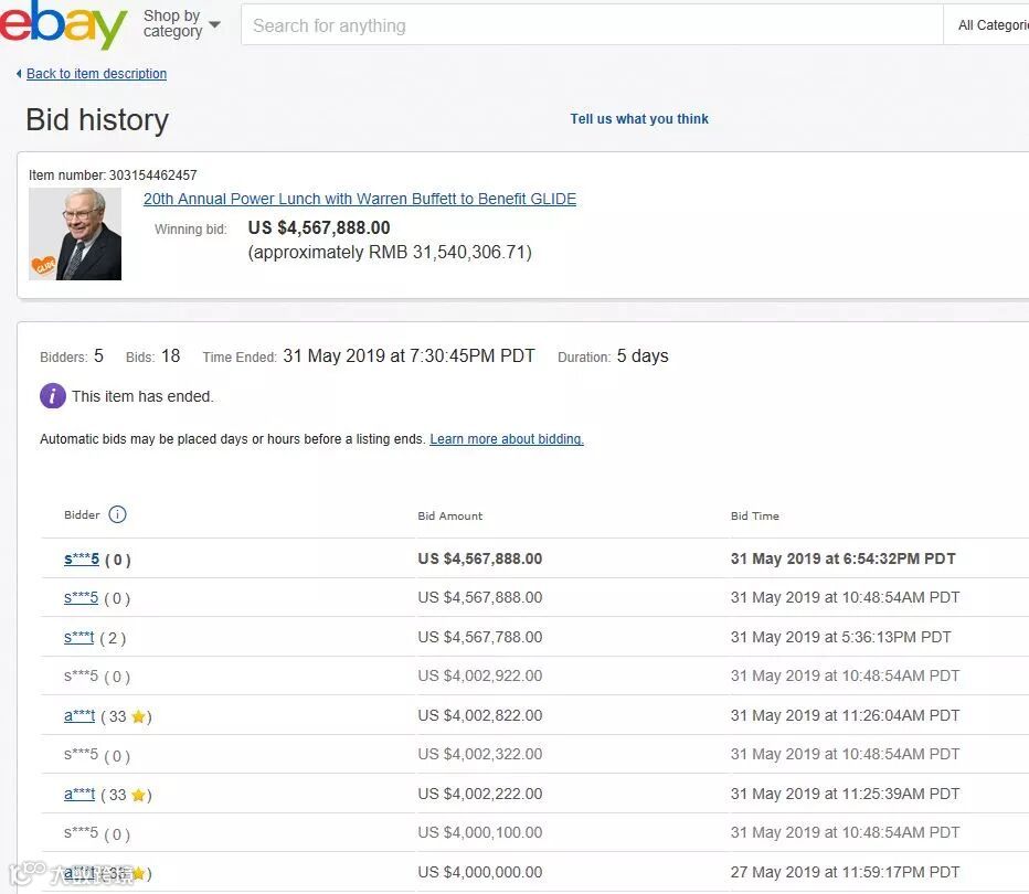 同前三年一样,今年巴菲特慈善午餐的最终获胜者仍然是一位神秘的匿名买家,身份信息目前还没有公布,他(或她)在ebay的用户名是s***5。在ebay的拍卖记录中,s***5在最后一个拍卖日与另一位拍卖者a***t展开疯狂竞争,最终获胜。