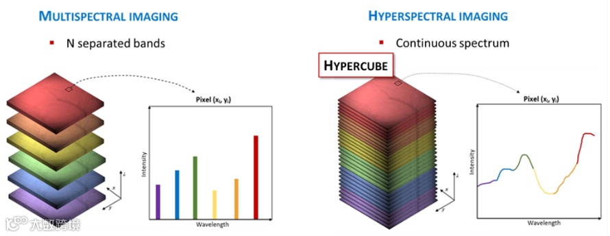 高光谱成像(HYPERSPECTRAL IMAGING)是一种结合了光谱和成像的新型分析技术,它在同一空间区域收集数百张不同波长的图像,每幅图像都是在电磁波谱的狭窄波段获得的,收集到的数据形成了一个所谓的高光谱立方体,其中两个维度表示场景的空间范围,第三个维度表示光谱成分。人眼看到的光有三个波段(红、绿、蓝),而高光谱成像同时还覆盖了电磁波谱的近紫外以及近红外波段,以精细的波长分辨率为场景的每个像素测量光的连续光谱。