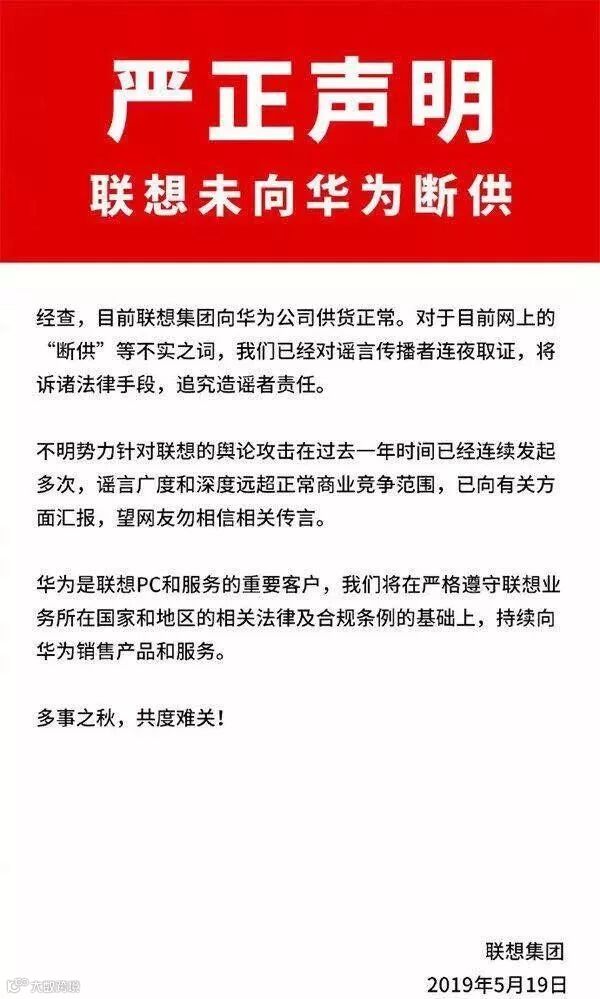 对此,联想集团连夜发布声明称,经查,目前联想集团向华为公司供货正常。对于目前网上的“断供”等不实之词,联想已经对谣言传播者连夜取证,将诉诸法律手段,追究造谣者责任。