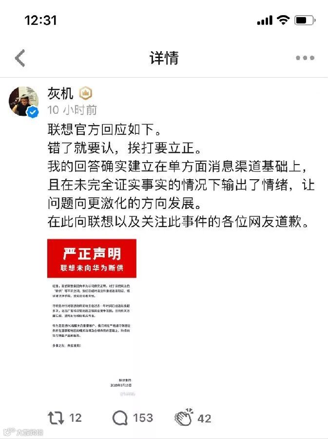 联想发布声明后,知乎造谣“联想断供华为”者发文道歉称:“本帖的评价建立在谣言以及部分员工回复的基础上,现已删除,并向联想集团及广大关注此事件的网友道歉”。